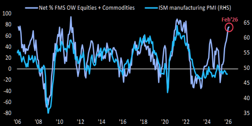 Il primo tassello è il posizionamento degli investitori, che continua a suggerire compiacenza ciclica, nonostante segnali di raffreddamento. Il dato più eloquente è la percentuale netta di gestori che risultano sovra pesati su azioni e commodity, che torna sui massimi da inizio 2022, mentre l’ISM manifatturiero non conferma un’accelerazione coerente. La distanza tra appetito per il rischio e termometro dell’economia reale è ampia e, storicamente, quando questo gap diventa estremo tende a chiudersi più spesso via “risk off” che via improvviso boom macro. A rendere il quadro più instabile c’è anche la qualità del rischio assunto. Non è solo “lunghi di azioni”, è “lunghi di azioni e materie prime” in un mercato dove la volatilità di sotto-settore resta elevata e dove il premio per la liquidità sta risalendo. Questa è la classica situazione in cui basta un evento relativamente piccolo (una guidance, un utile “sbagliato”, un riprezzamento dei tassi reali o del dollaro) per innescare una fase di riduzione della leva finanziaria sproporzionata rispetto alla notizia. In altre parole, il rischio non è tanto un crollo lineare, quanto la probabilità che una discesa inizialmente circoscritta diventi sistemica, perché trova posizionamenti già tirati e una microstruttura pronta ad amplificarlo.