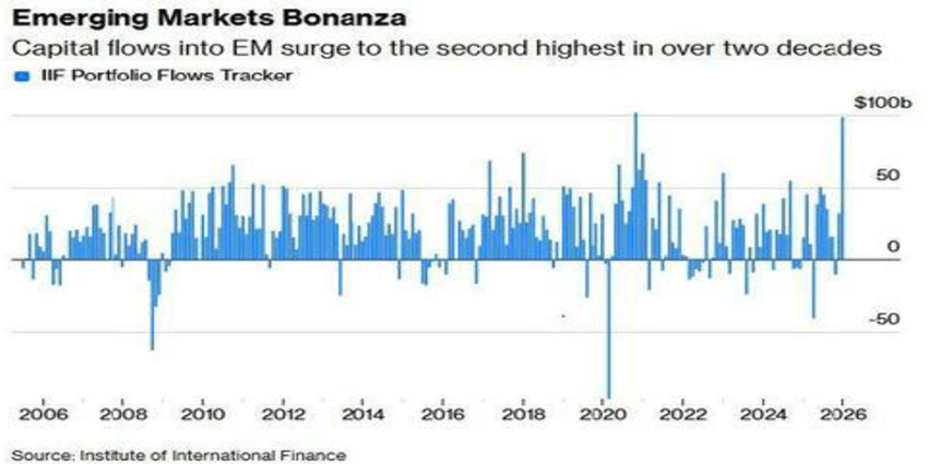 Il tema “Stati Uniti rispetto al Resto del Mondo” aggiunge un ulteriore livello di complessità. Da un lato, i flussi verso i mercati internazionali ed emergenti sono forti e diffusi, come mostra il grafico. Tutte le regioni dei paesi emergenti stanno beneficiando di flussi in entrata, segnale di una fiducia che si auto-alimenta.
