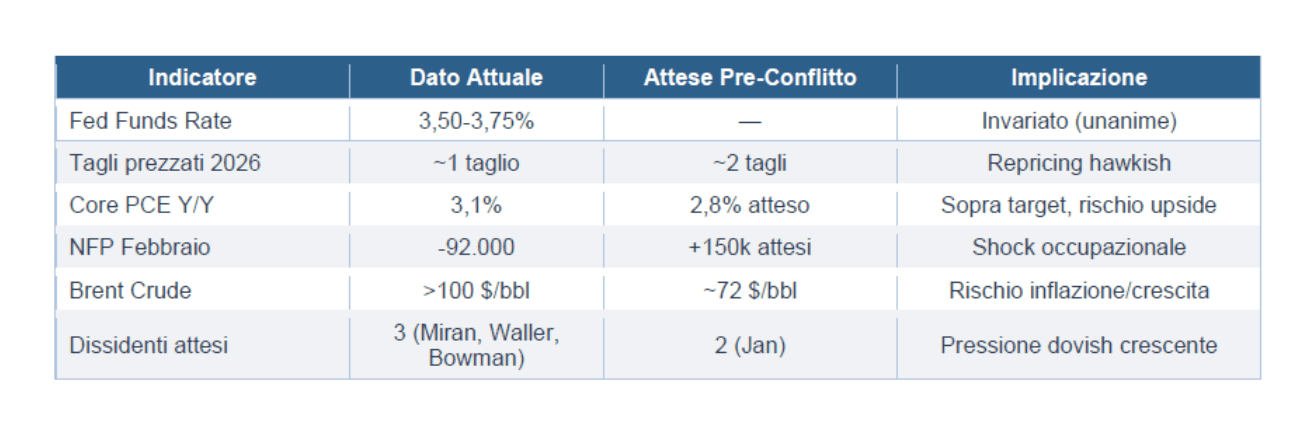 Il contesto in cui si muove la Fed è quello di una banca centrale intrappolata tra i due lati del proprio mandato. Da un lato, l'inflazione resta superiore all'obiettivo e rischia di ricevere ulteriore impulso dall'aumento dei prezzi energetici. Dall'altro, il mercato del lavoro sta iniziando a rallentare e diversi membri del Comitato temono che l'impatto dell'Intelligenza Artificiale sull'occupazione possa amplificare questo indebolimento nei prossimi trimestri. Non sorprende quindi che all'interno del Comitato stia emergendo una divisione crescente tra chi preferisce attendere prima di tagliare i tassi e chi ritiene necessario intervenire per sostenere l'attività economica. Proprio su questo punto potrebbe emergere uno dei segnali più interessanti della riunione. Dopo i due voti dissenzienti registrati a gennaio, diversi analisti si aspettano che il numero dei membri favorevoli a un taglio immediato salga a tre, con l'eventuale aggiunta della governatrice Bowman al fronte più accomodante. Anche se questo non cambierebbe l'esito della decisione finale, rappresenterebbe il segnale più evidente di un dibattito interno sempre più acceso.